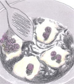 Öl in der Pfanne erhitzen, mit einer Kelle den Teig in die heisse Pfanne füllen und verteilen, sofort ein paar Brombeeren darüber streuen und mit dem Pfannenwender in den frischen Teig eindrücken. Sobald der Pfannekuchen am Rand braun wird, wenden. Die fertigen Pfannekuchen auf einem Teller aufstapeln, jeweils einen knappen EL Zucker auf jeden Pfannekuchen streuen.