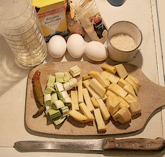 Den Reis in einer Tasse abwiegen, und gut das doppelte Volumen Wasser mit etwas Salz in einem kleinen Topf aufsetzen. Wenn das Wasser kocht, den Reis hinzufügen und 15 Min. köcheln lassen.