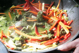 Auf größter Stufe erhitze ich den Wok und brate das Fleisch kross an. Danach wird Mondamin darüber gestreut und mit angebraten, mit Gemüsebrühe abgelöscht und das Gemüse dazugegeben, bis auf den Bärlauch und die Sprossen.
