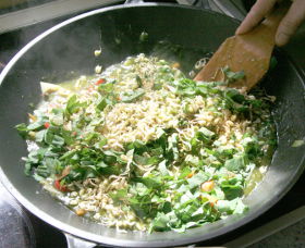 Während der Reis vor sich hin köchelt, schneide ich das Gemüse in feine Streifen.