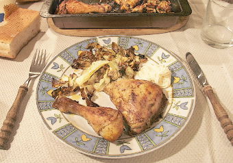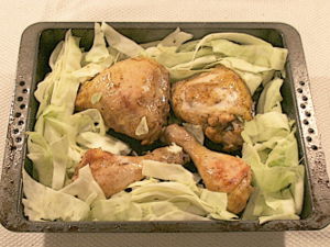 Derweil den Kohl in nicht zu kleine Stücke schneiden und jetzt zwischen den Hühnerbeinen verteilen. Weitere 20 Min. auf 200° schmoren lassen und dann die Hitze auf 160°reduzieren. Den Kohl zwischen den Hühnerbeinen zwischendurch mal umrühren.