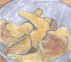 Die Marinade anrühren: erst Öl mit Salz, Pfeffer, Paprika und Curry vermischen, dann Zucker und Essig zugeben und gut umrühren. Die Hühnerbeine in einer Schüssel mit der Marinade einreiben. Möglichst lange ziehen lassen.