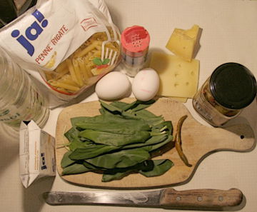 Den Bärlauch (Bärlauch sammeln s.S.xxx) abwiegen und grob kleinschneiden. Wenn die Eier fast fertig sind den Bärlauch am Rand der Pfanne verteilen, kurz den Deckel drauf machen. Einmal die Eier mit dem Bärlauch umdrehen, vom Herd nehmen und den Deckel schließen.
