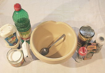 Jetzt kann man die Salatsauce anrühren. Die Majo mit Salz, Pfeffer und dem Rosmarin verrühren, dann Zucker und Essig zugeben und weiterrühren. Die Sahne hinzufügen, gut umrühren. Gucken, ob die Konsistenz gut ist, und solange vorsichtig Ananaswasser hinzufügen, bis die Konsistenz stimmt. Nochmal probieren, die Sauce alleine muss ganz kräftig schmecken, vielleicht noch Salz, Zucker oder Essig hinzufügen.
