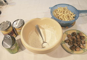Als erstes die Erbsen-, Mais- und Ananasdosen wowie Majo und Sahne in den Kühlschrank stellen. Nudelwasser aufsetzen und die Pilze in etwas Öl in einer kleinen Pfanne anbraten. Wenn die Nudeln gut sind abschütten und im Durchschlag unter fließendem Wasser komplett abkühlen. Die fertig gebratenen Pilze auf einen Teller geben. Nudeln und Pilze jetzt 1 bis 2 Stunden kalt stellen.