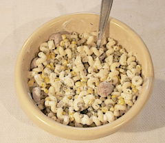 Nur noch die Erbsen, den Mail, die Ananasstücke, die Nudeln und die Pilze zugeben und gut umrühren. Der Nudelsalat ist jetzt fertig, und hält sich 24 Stunden. Schmeckt mit Fleisch, Bockwürstchen oder als Beilage für Fetenbuffets aller Art. Manch einer mag etwas Fladenbrot dazu.