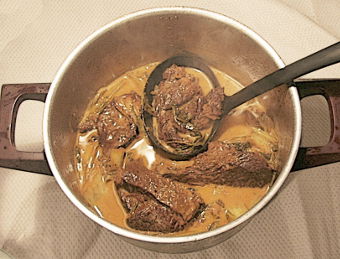 Öl in einem mittelgroßen Topf erhitzen und das Fleisch darin von allen Seiten vorsichtig anbraten. Kochendes Wasser angießen und 50 Min. köcheln lassen. Gucken, dass das Wasser nicht verkocht.