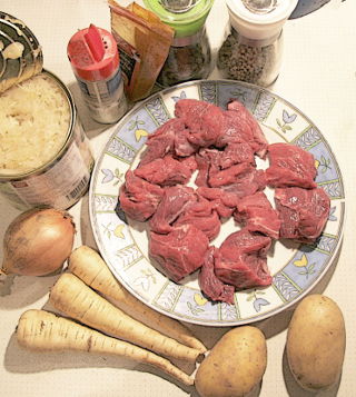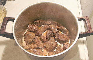 Das Öl in einem mittelgroßen Topf erhitzen. Den Gulasch mit Paprika, Piment und weißem Pfeffer würzen und in dem heißen Öl gründlich von allen Seiten anbraten. Jetzt etwas salzen und mit reichlich kochenden Wasser ablöschen und 1 Stunde köcheln lassen. Dabei gucken, dass das Wasser nicht zwischendurch verkocht, aber nach Ablauf dieser Stunde sollte es verkocht sein, ggf. die Hitze kurz erhöhen.