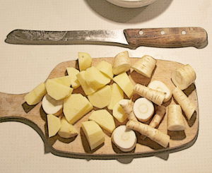 Derweil die Kartoffeln schälen und in kleine Stücke schneiden, die Pastinaken waschen und in genauso große Stücke schneiden und den Knoblauch in dünne Scheiben schneiden. Die Kartoffeln hinzufügen, 5 Min. später den Knoblauch und die Pastinaken hinzufügen und weitere 5 Min. später die Rosinen hinzufügen.