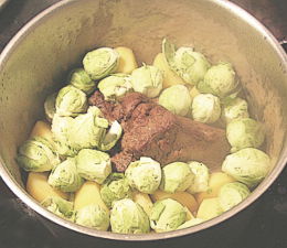 Tip: Statt Rosenkohl geht auch Weisskohl, der muss 30 Min früher dazu. Oder Lauch, den kann man 5 Min. später in den Topf geben als den Rosenkohl.