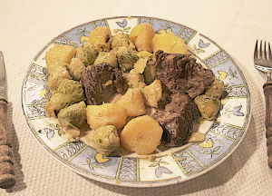 Die Kartoffeln schälen, in Stücke schneiden und hinzufügen. Den Rosenkohl putzen und 5 Min. später ebenfalls hinzufügen. Nach Geschmack noch 2 Nelken zugeben.