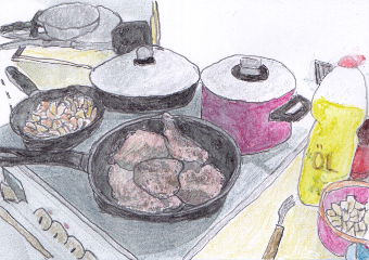 Die Leber waschen und mit Küchentuch abtrocknen. Einen Teller mit Mehl bereitstellen. ÖL in zwei Pfannen erhitzen. Die Leberstücke pfeffern, kurz im Mehl wenden und in den heißen Pfannen verteilen. Vorsichtig von einer Seite braten. Nach 5 Minuten die Leberstücke umdrehen, etwas Salzen. Auf kleiner Hitze 10 Min. weiterschmoren. Dann alle Leberstücke in eine Pfanne packen, Deckel drauf machen und auf der noch heissen Pfanne noch 10 Min. ziehen lassen.