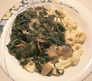 Salzwasser für die Tortellini aufsetzen. Das Öl in einer kleinen Pfanne erhitzen, die Zwiebeln in Spalten schneiden und anbraten. Den Knoblauch in Scheibchen schneiden, und mit anbraten. Die Brennnesseln in der Salatschleuder waschen und obendrauf geben und den Deckel schließen. Mit Pfeffer und Salz würzen, noch 10 Min schmoren und mehrmals umrühren.